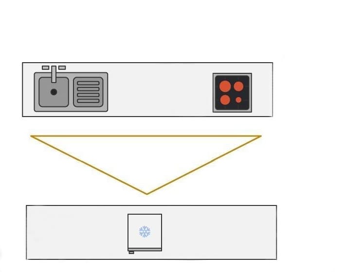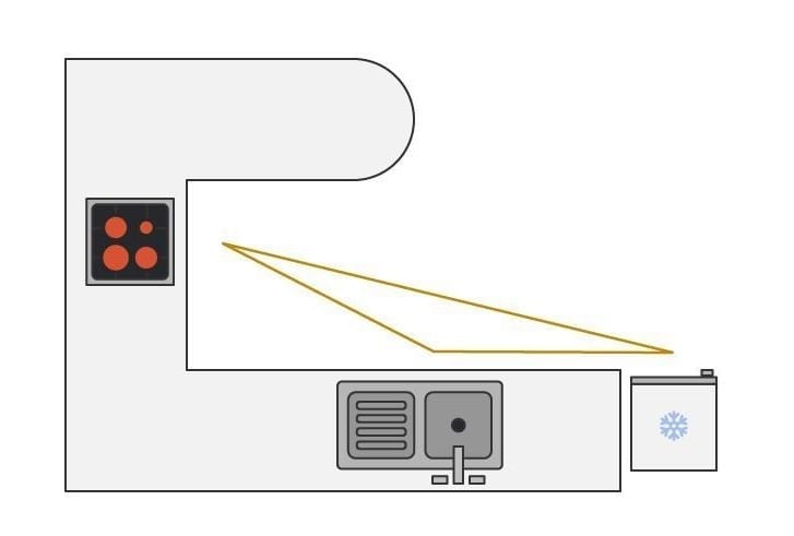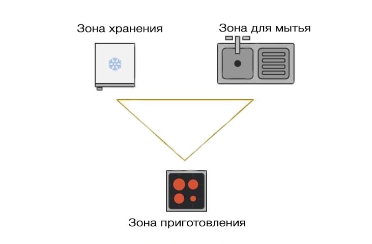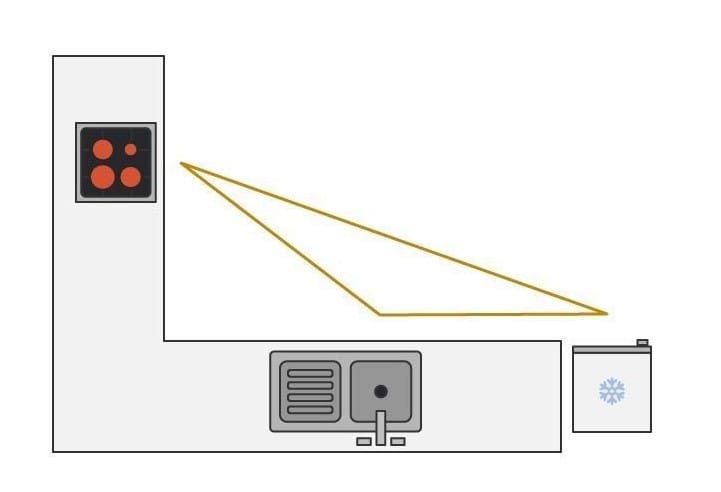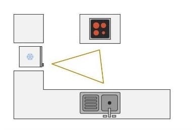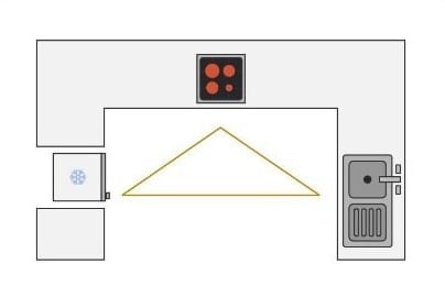 «Правило рабочего треугольника берет свое начало в 1920 году в Германии. В процессе исследования измеряли путь, который проделывал человек и затраченное время на выполнение задач на кухне. Целью исследования было определение расположения мебели и техники таким образом, чтобы при приготовлении еды человек тратил минимум времени и проходил минимальный путь. Были названы три основные рабочие точки: место для подготовки еды, для мойки и для ее приготовления, соответственно это разделочный стол, мойка и плита. Со временем разделочный стол заменили на холодильник.»