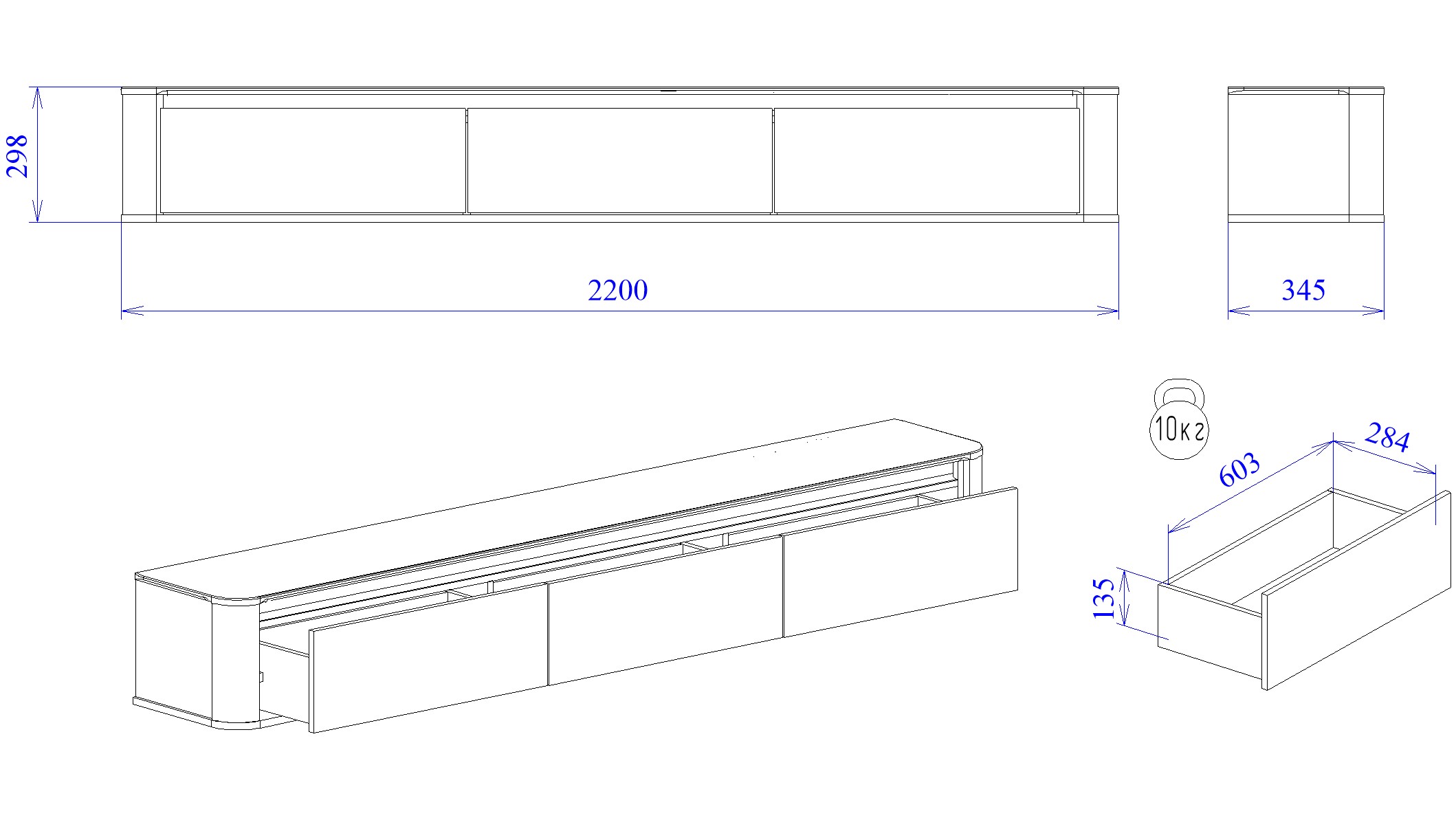 Наполнение тумбы - 3 выдвижных ящика с доводчиками. Шариковые направляющие надежно удерживают ящики при открывании.