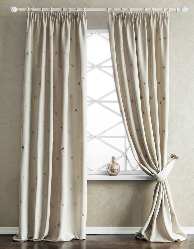 Прямые портьеры на шторной ленте из плотной декоративной ткани "Ибица" с вышивкой. В комплект входят декоративные подхваты. Состав - 100% полиэстер.