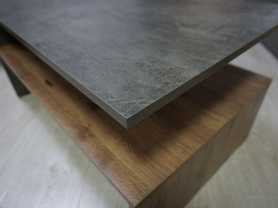 Крышка стола, выполненая в цвете "Камень темный", отлично сочетается с древесным декором основания стола.