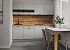 Модульная кухня «Смарт» выполнена в лаконичном стиле, подходит для современных интерьеров хай-тек, сканди, лофт, минимализм. Сочетание однотонных фасадов со столешницей и фартуком в фактуре дерева выглядит эффектно. Контрастные стеклянные вставки с шелкографией в верхних модулях и накладные геометрические ручки завершают выразительный образ.