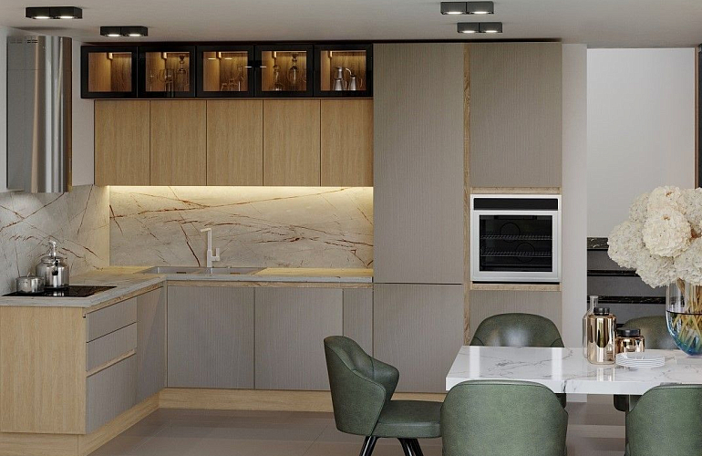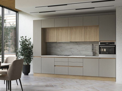 В кухне используется ручка-профиль, которая не входит в комплект модуля (за исключением пеналов) и реализуется погонажем, что исключает стыки между модулями при монтаже.