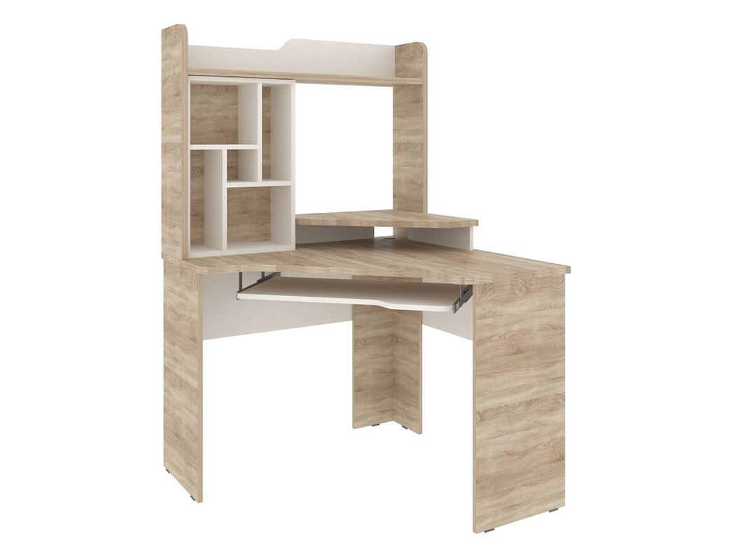 В столе расположены открытые полки, выкатная полка для клавиатуры, полка для монитора.