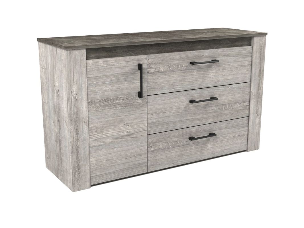 В комоде Денвер располагаются три выдвижных ящика и отдел с полкой. Шариковые направляющие надежно удерживают ящики при открывании.