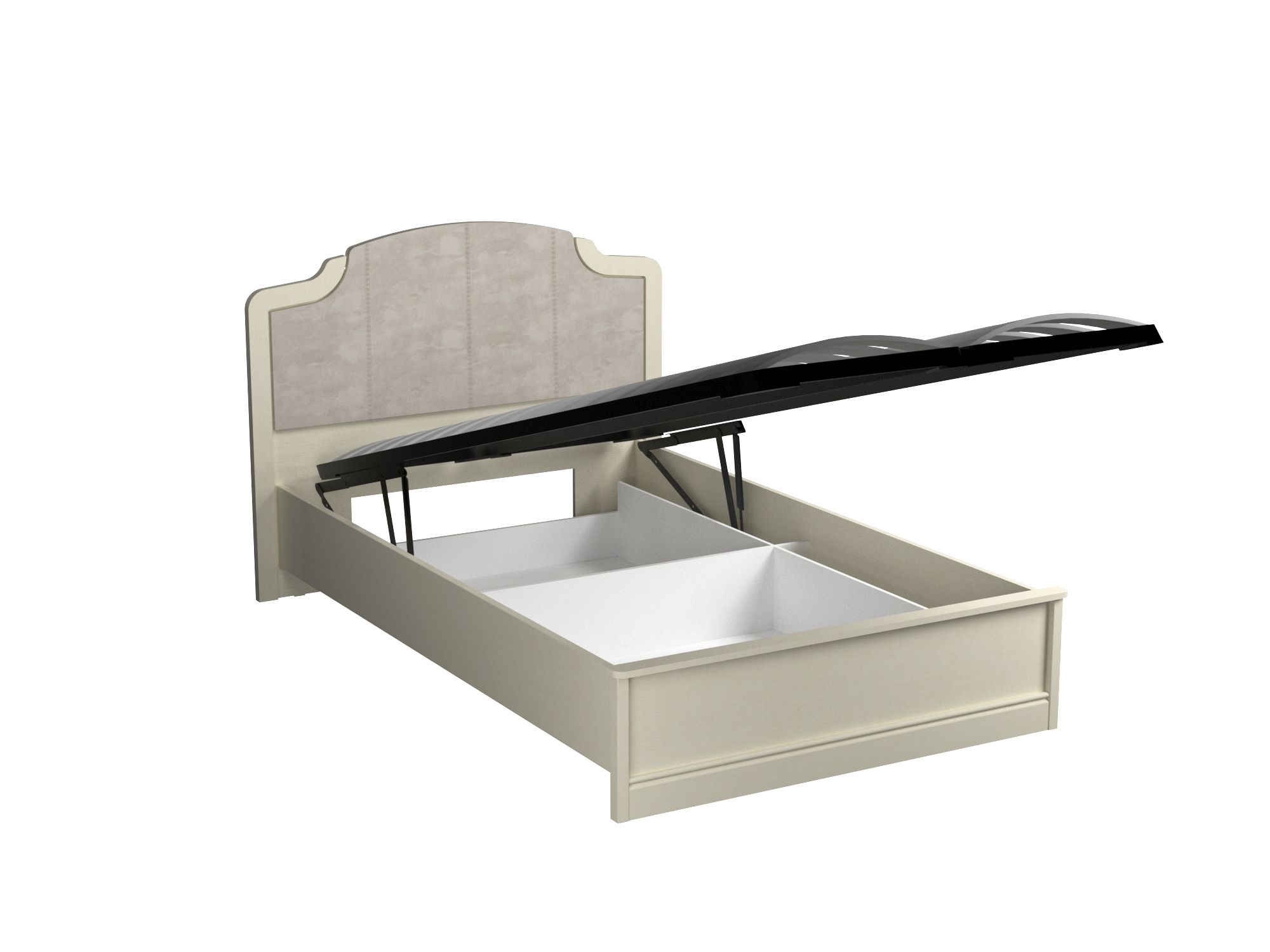 Внутри конструкции кровати располагается короб для хранения с двумя отделениями. Подъемный механизм обеспечит быстрый доступ к внутреннему пространству кровати.