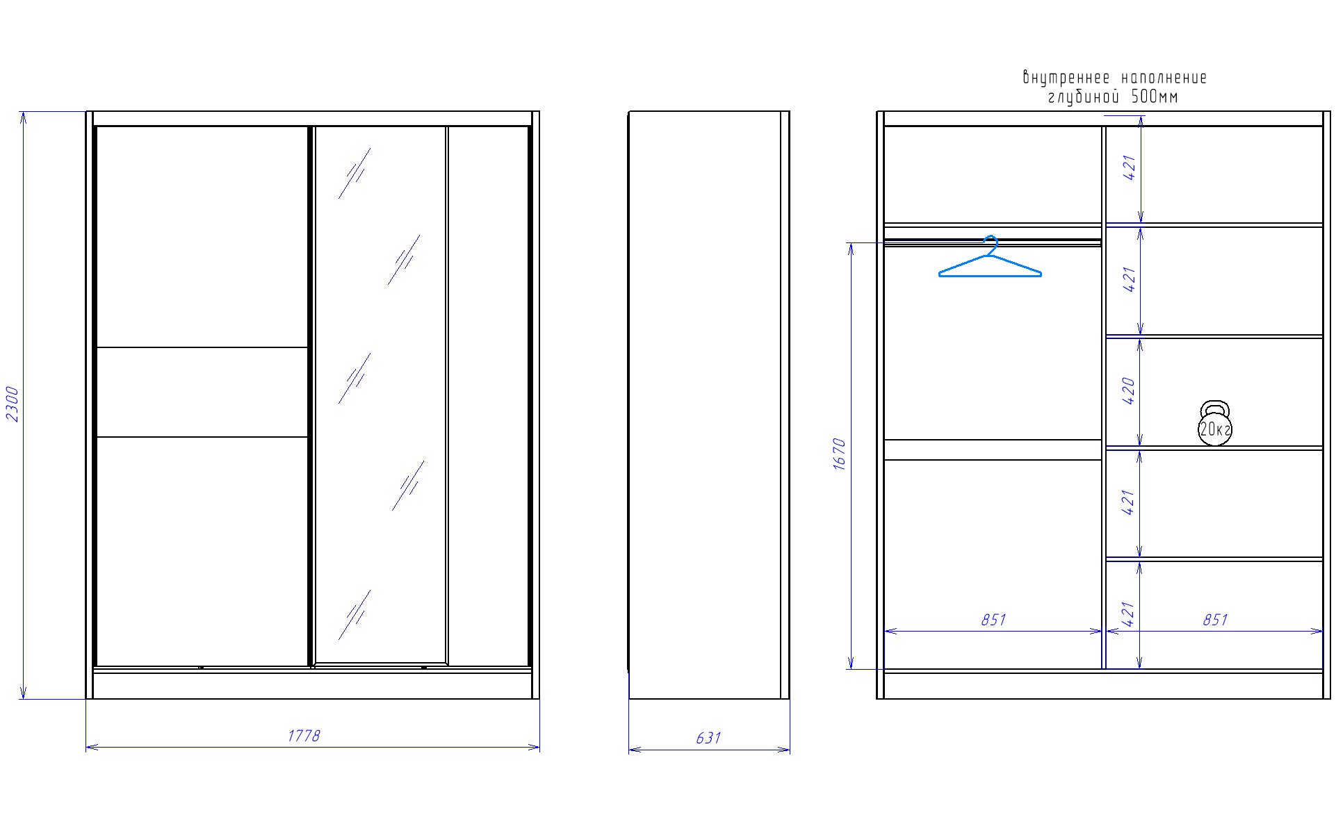 Внутри шкафа-купе два отдела: с полками и штангой для вешалки. Система шкафа-купе SAMET способствует мягкому и надежному движению дверей по направляющим.