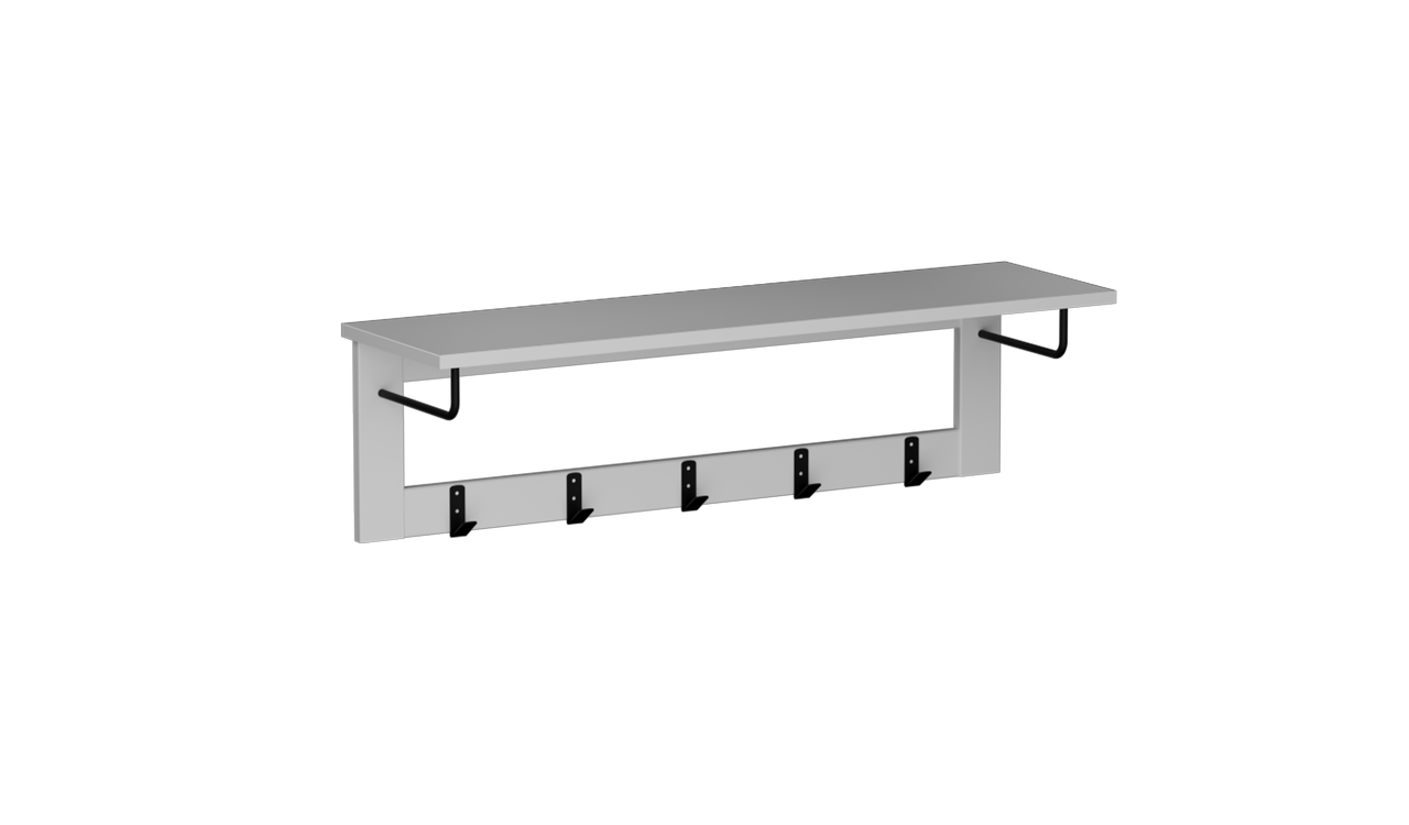 Модель не занимает много места, при этом позволяет аккуратно повесить на крючках повседневную верхнюю одежду, а на полочке — хранить головные уборы или коробку с сезонными аксессуарами.