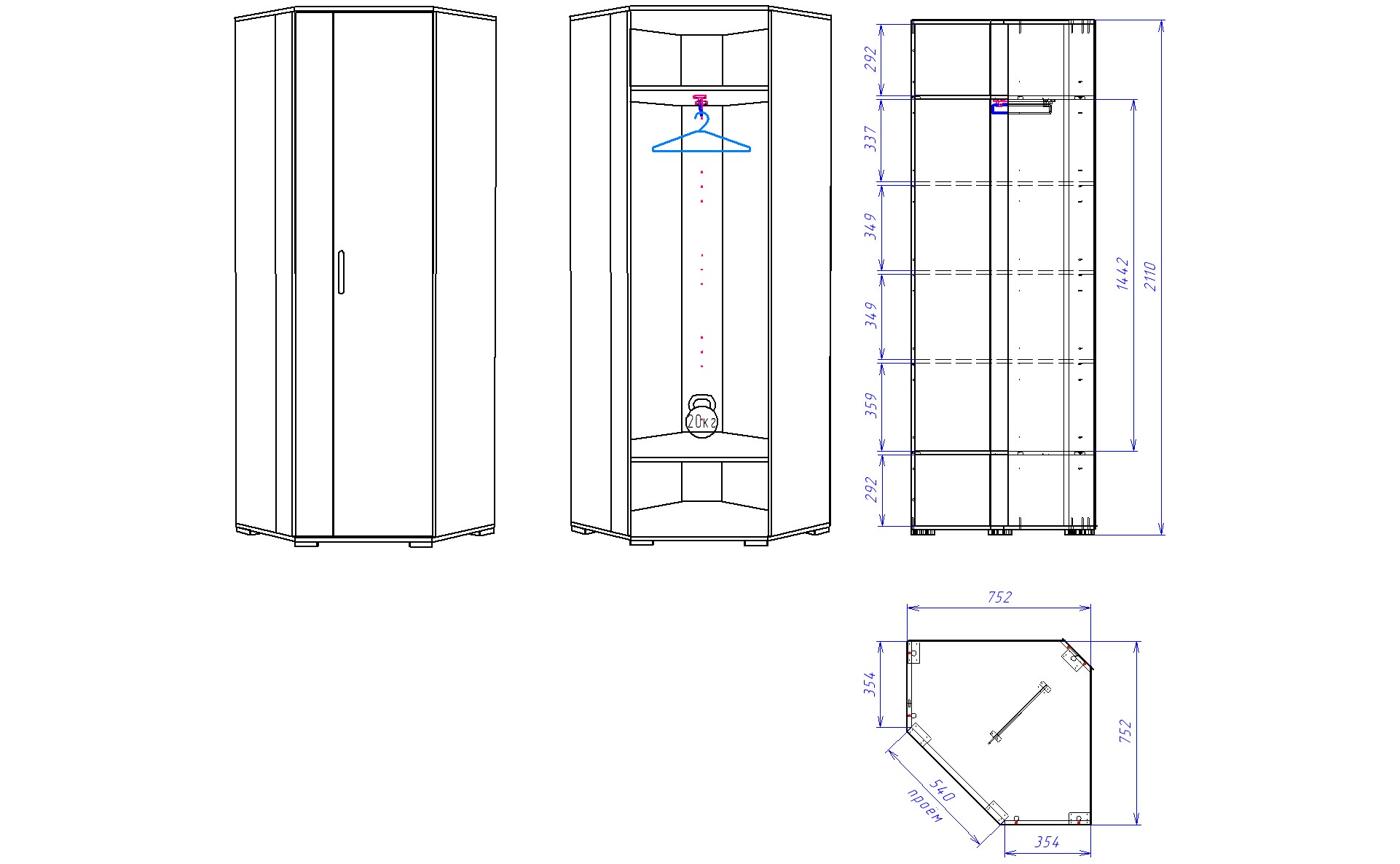 В угловом шкафу Ханна располагаются полки и выдвижная штанга для вешалки. Дополнительно комплектуется полками из этой коллекции.Угловой шкаф не только практичен наполнением, с его помощью можно составить угловую секцию шкафов. Полноценная система хранения станет незаменимой для вас.