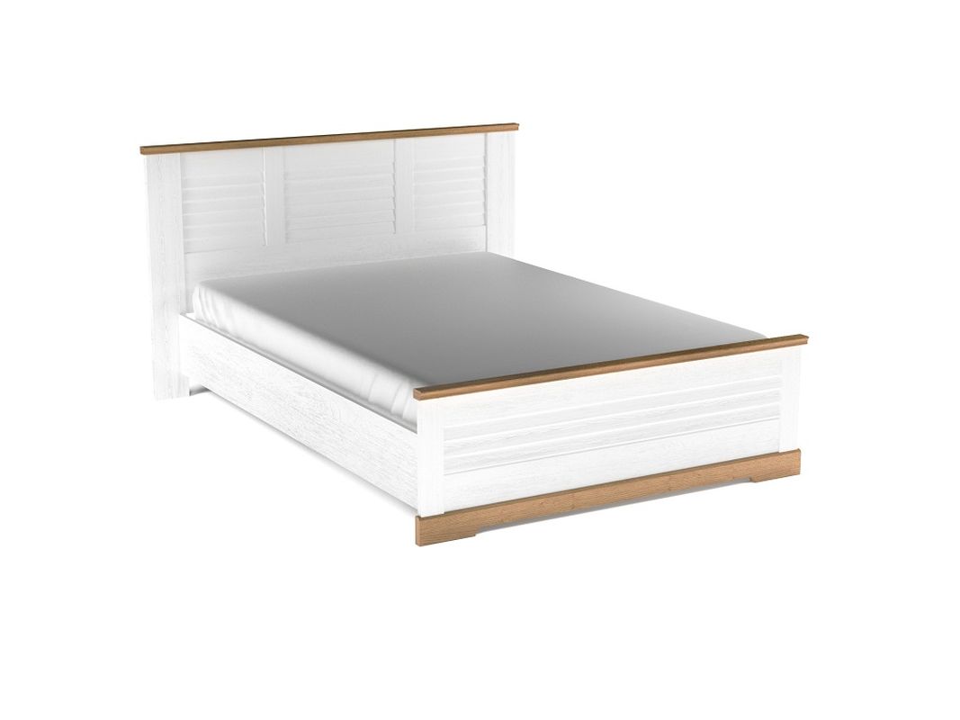 Кровать оформлена высоким ступенчатым изголовьем и изножьем.