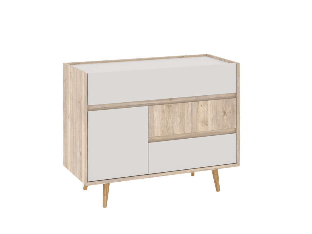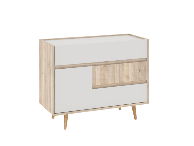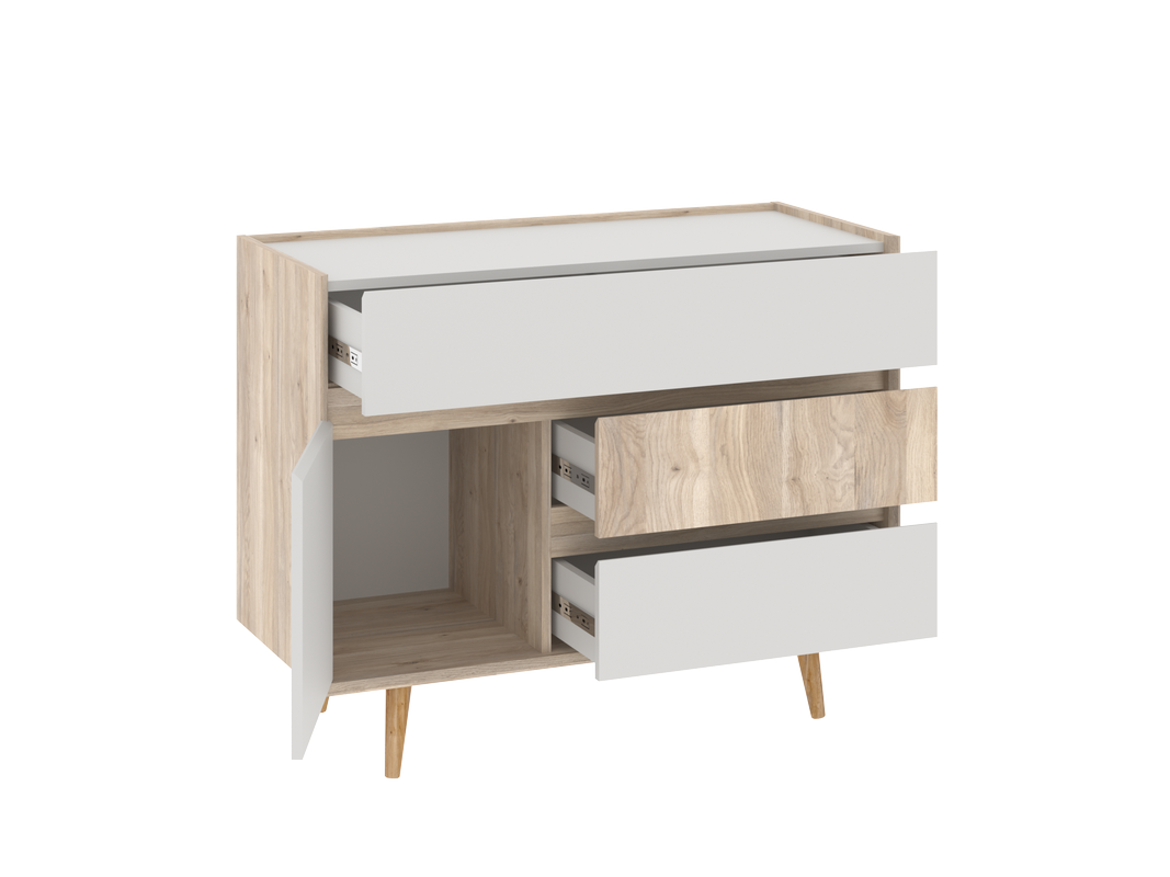 Благодаря применению в комоде «Аврора» технологии «софт-форминг» отпадает необходимость использовать ручки. Скоса на торце достаточно для удобного открывания ящиков и дверей.