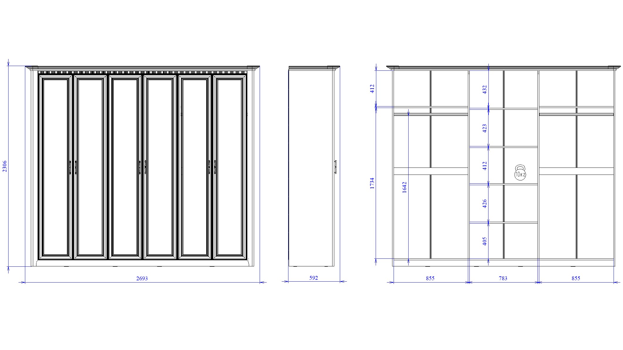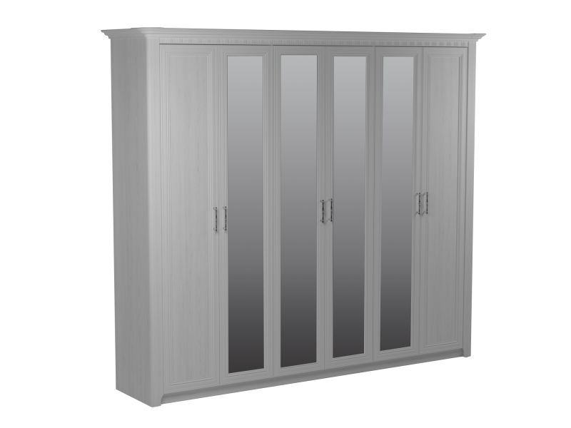 Шкаф 6-ти дверный Клер, Сосна Андерсен отражает тренд на лаконичность: никаких вычурных элементов, все внимание на выигрышную текстуру и оригинальную расцветку под дерево. А за красивым фасадом скрывается хорошо продуманное внутреннее пространство, на удивление даже более вместительное, чем можно было бы подумать, глядя на габариты (2 693*592*2 306мм).