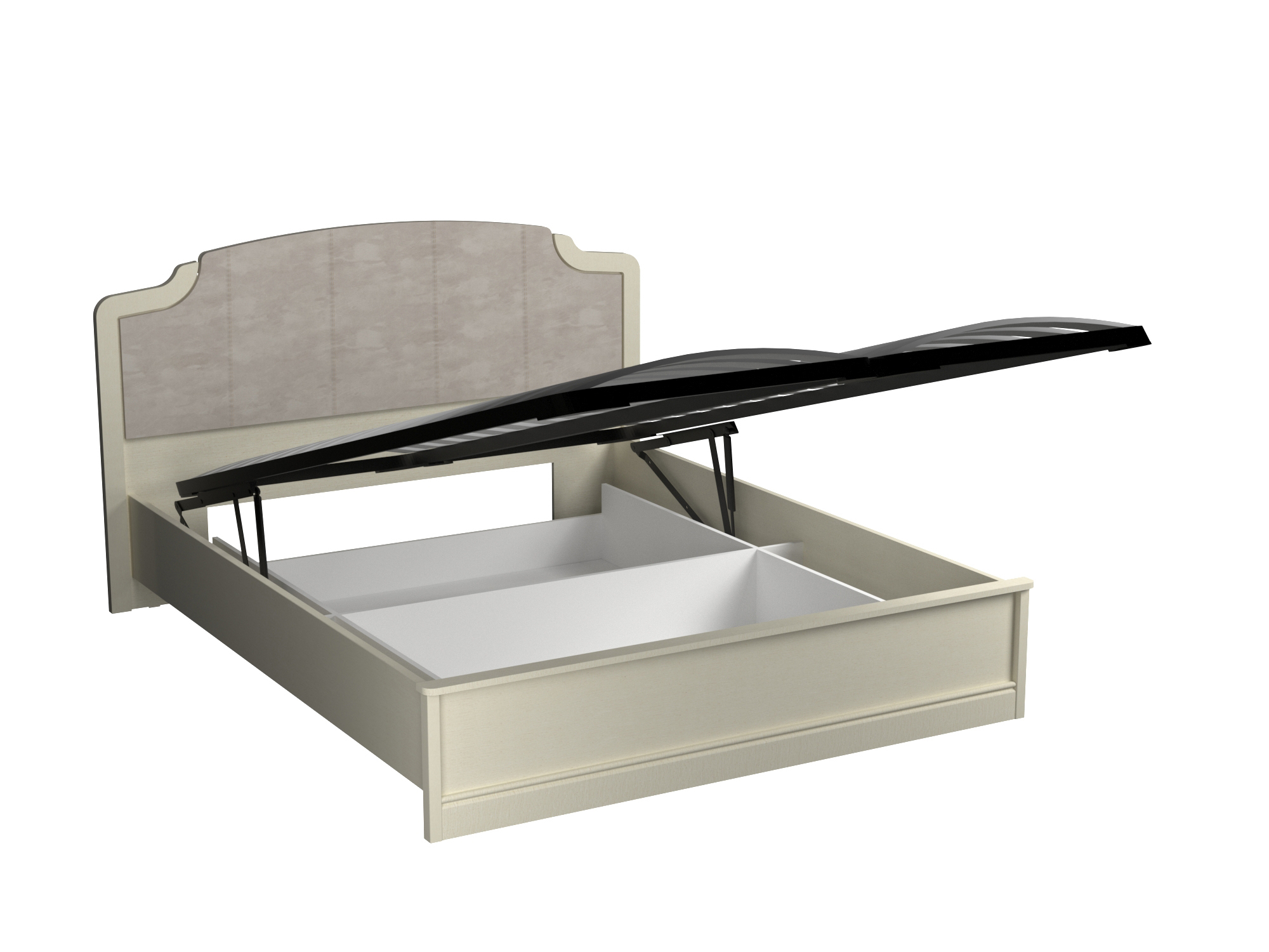 Внутри конструкции кровати располагается короб для хранения с двумя отделениями. Подъемный механизм обеспечит быстрый доступ к внутреннему пространству кровати.
