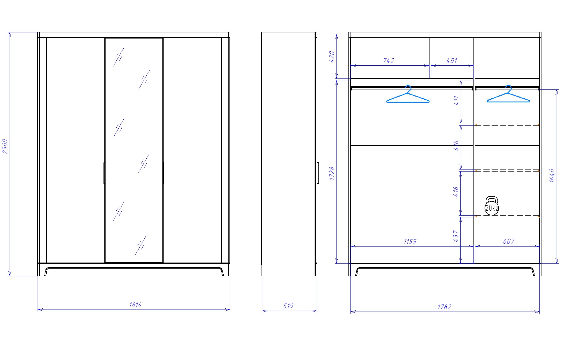 По необходимости дополнительно комплектуется полками в узкую часть шкафа.
