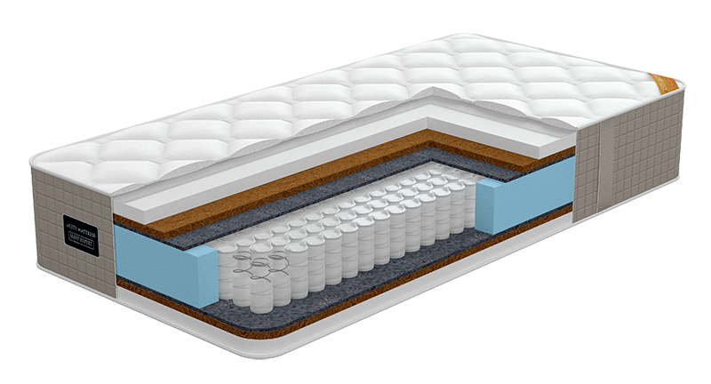 Пружинный блок «Pocket Spring», войлок — с двух сторон пружинного блока, кокосовая койра — с двух сторон, ППУ — с двух сторон, объемный слой синтепона.