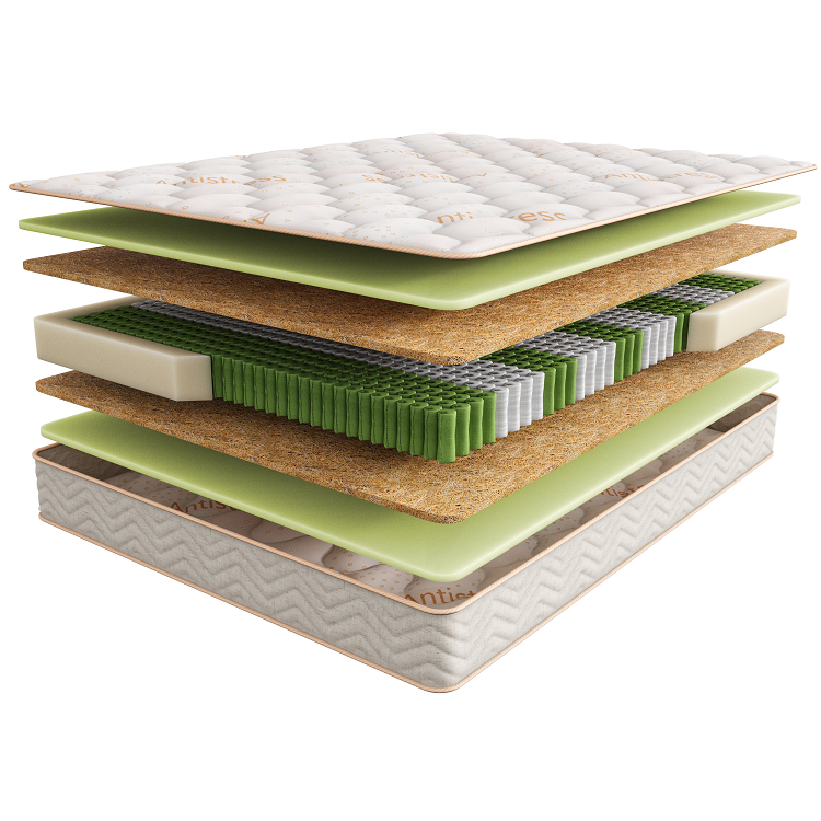 Антибактериальная пена с экстрактом эвкалипта, которая обладает абсорбирующими свойствами и сохраняет здоровый микроклимат внутри матраса и натуральный кокос, который выдерживает интенсивные нагрузки и придает матрасу жесткость и упругость.