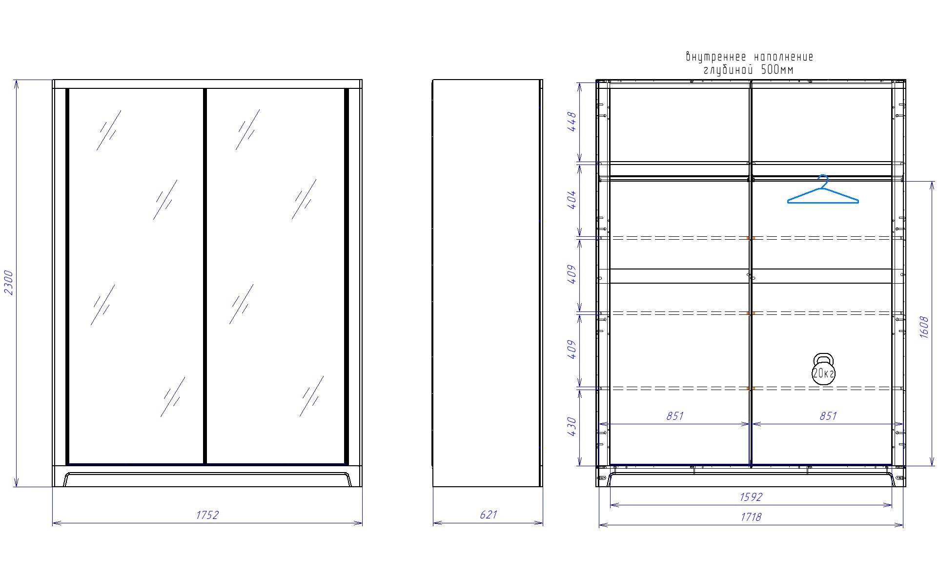Шкаф-купе Юта разделен на два отдела. Внутри каждого из отделов расположена одна полка и штанга для вешалки. При необходимости любой из отделов можно укомплектовать дополнительными полками. В доп комплекте три полки.