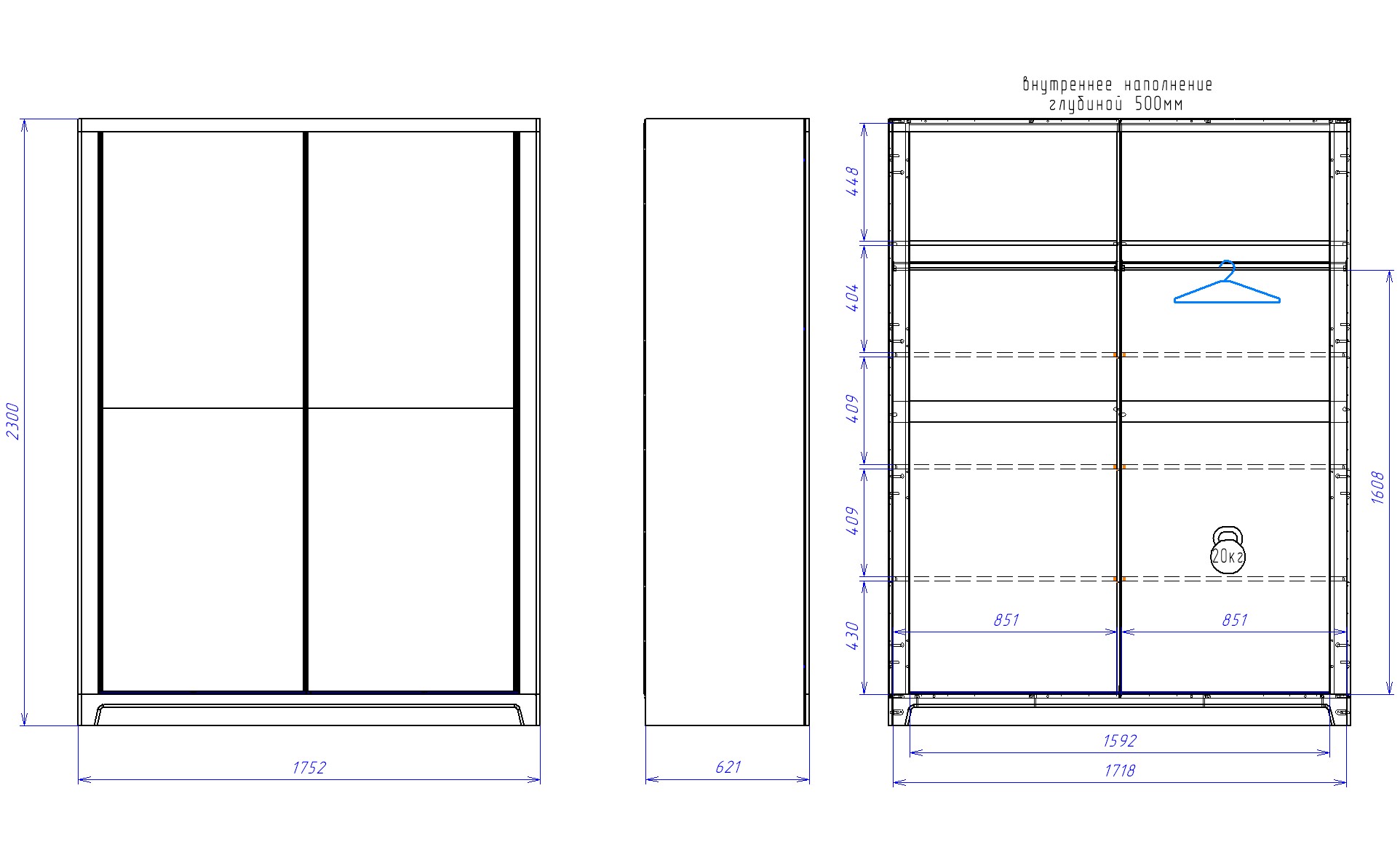 Шкаф-купе Юта разделен на два отдела. Внутри каждого из отделов расположена одна полка и штанга для вешалки. При необходимости любой из отделов можно укомплектовать дополнительными полками. В доп комплекте три полки.