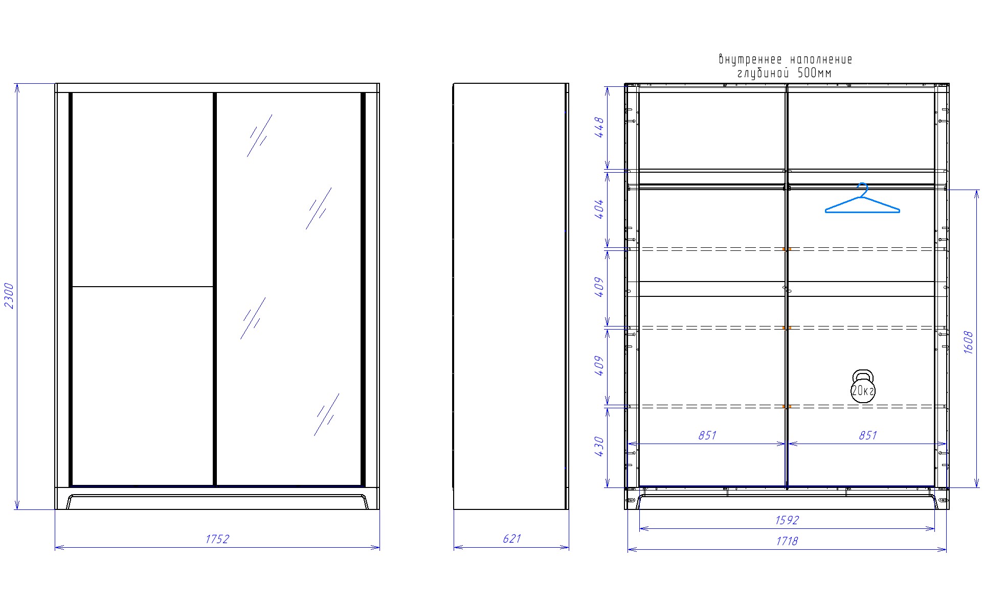 Шкаф-купе Юта разделен на два отдела. Внутри каждого из отделов расположена одна полка и штанга для вешалки. При необходимости любой из отделов можно укомплектовать дополнительными полками. В доп комплекте три полки.