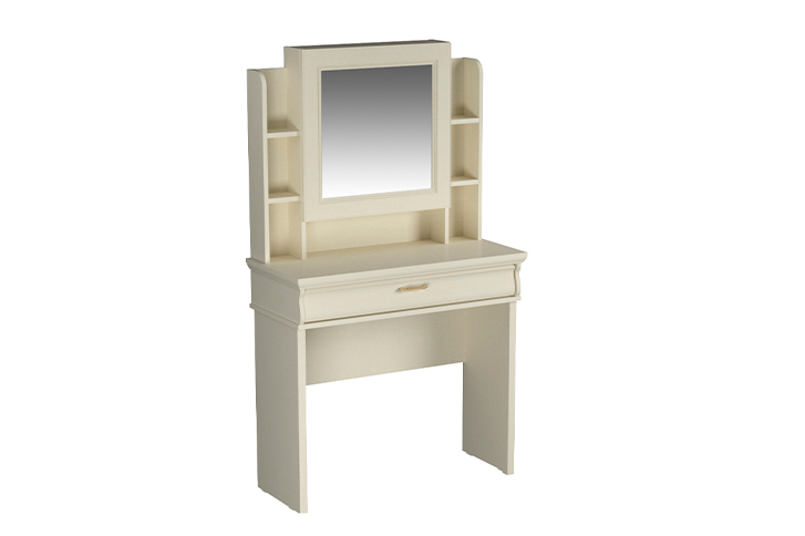 Туалетный столик укомплектован надстройкой с полками и зеркальной дверью.