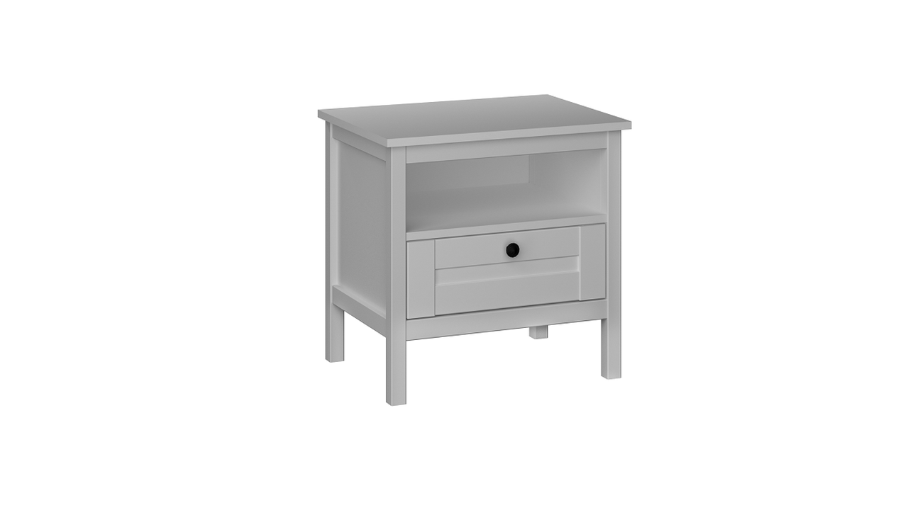 Прикроватная тумба дополнена открытой полкой и ящиком. Шариковые направляющие надежно удерживают ящик при открывании.