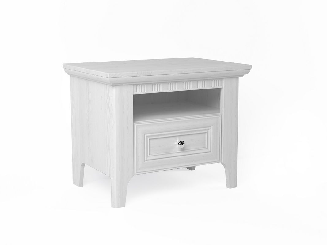 Прикроватная тумба дополнена открытой полкой и ящиком. Шариковые направляющие надежно удерживают ящик при открывании.